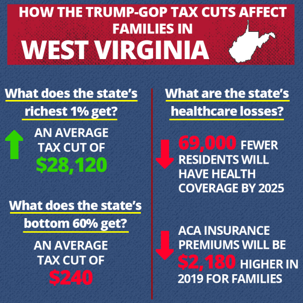 To sell the GOP tax cuts, Trump claimed that working families would benefit the most. This is far from the truth. The new tax law provides WV’s richest 1% with an average tax cut of $28,000. To help pay for this massive tax giveaway for the wealthy and corporations, Trump’s tax plan repealed key provisions of the Affordable Care Act that will increase the number of uninsured residents in WV by 69,000 and raise ACA insurance premiums will rise by $2,100 on average.