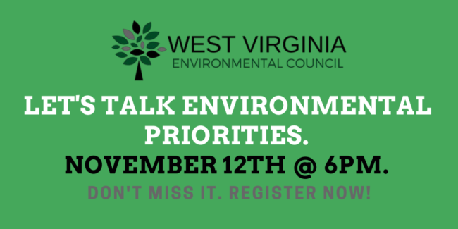 Register Today for the WV Environmental Council’s virtual Annual Meeting to Talk About the Future of West Virginia’s Environment, on Thursday, November 12 from 6:00 -8:00 pm.