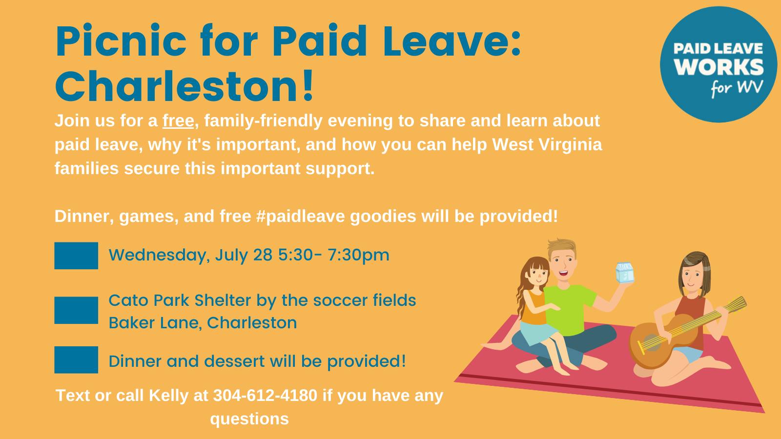 Join Paid Leave Works for WV in Charleston, WV at Cato Park for free food and dessert, games for kids, and to talk about how you can help make paid leave a reality this year!