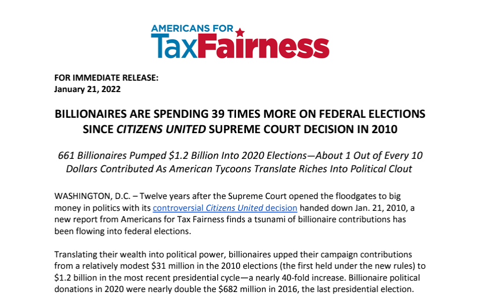 WASHINGTON, D.C. – Twelve years after the Supreme Court opened the floodgates to big money in politics with its controversial Citizens United decision handed down Jan. 21, 2010, a new report from Americans for Tax Fairness finds a tsunami of billionaire contributions has been flowing into federal elections.