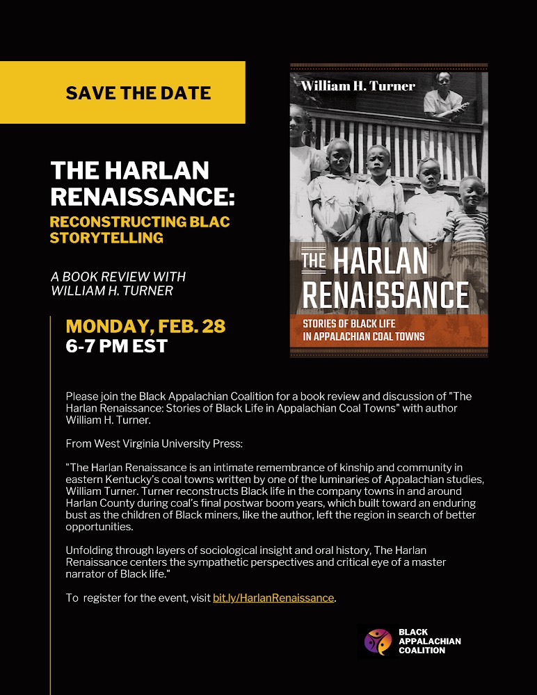 Please Join the Black Appalachian Coalition for a book review and discussion of “The Harlan Renaissance: Stories of Black Life in Appalachian Coal Towns” with the author William H. Turner.