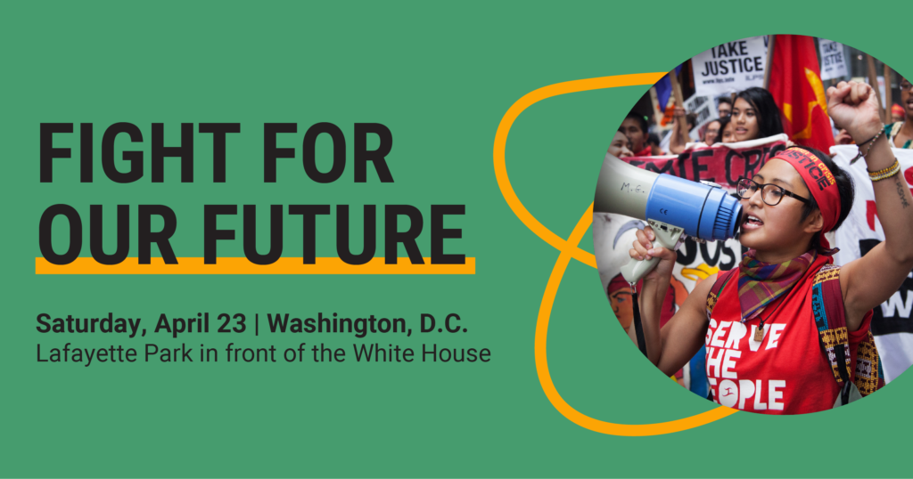 Sign the Fight for our Future pledge now, and RSVP to join us in Lafayette Square in front of the White House at 1pm on Saturday, April 23rd to demand bold action on climate, care, jobs, and justice!