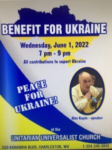 On Wednesday, June 1st, from 7-9PM, the Unitarian Universalist Church of Charleston, WV will be hosting a benefit fundraiser for Ukraine, located at 520 Kanawha Blvd, Charleston, WV.
