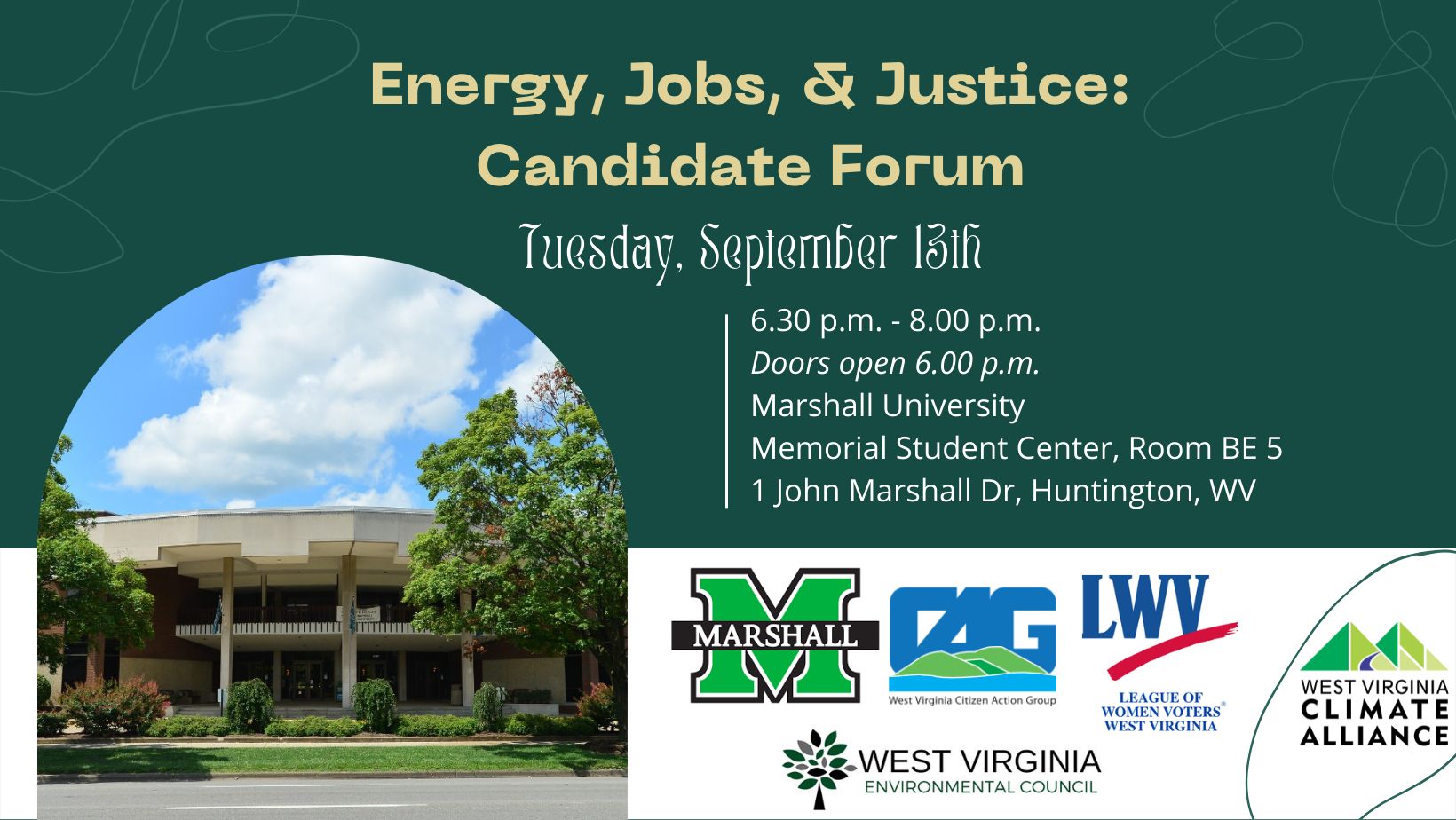 Join the West Virginia Climate Alliance, Marshall University, Citizen Action Group, Environmental Council, and League of Women Voters for a candidate forum on Tuesday, September 13th from 6:30pm to 8:00pm (Doors open at 6:00pm) at the Marshall University Memorial Student Center, room BE5 (1 John Marshall Dr, Huntington, WV 25755).