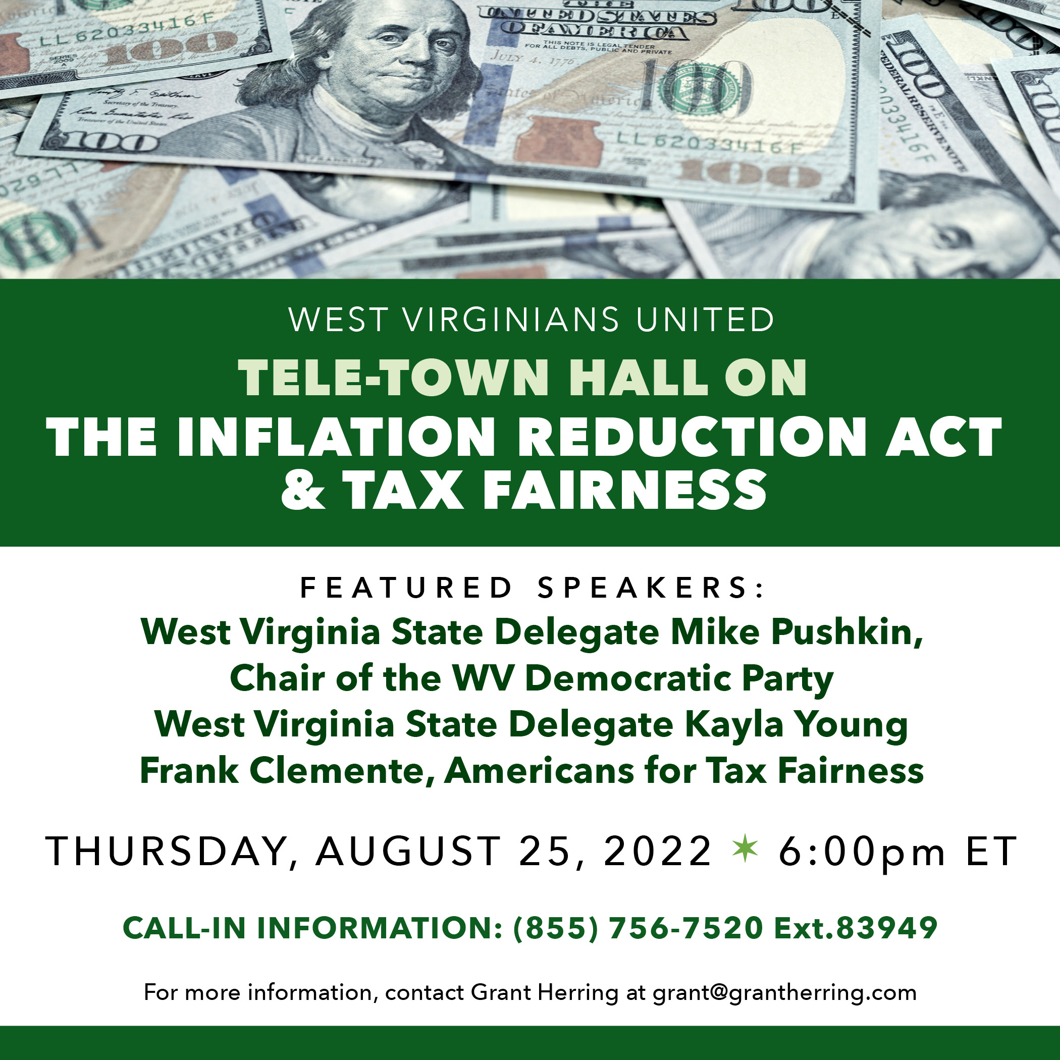 Tele-Town Hall on the Inflation Reduction Act & Tax Fairness WVCAEF August 24, 2022 Blog Join West Virginians United for a Tele-Town Hall regarding the Inflation Reduction Act & Tax Fairness on Thursday, August 25th at 6pm! For more information please call (855) 756-7520 Ext. 83949 OR contact Grant Herring at grant@grantherring.com