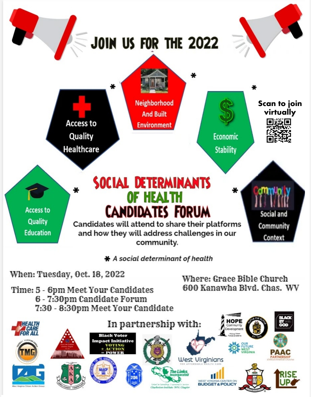 You are cordially invited to attend and participate in our Social Determinants of Health and Health Equity Candidate Forum for the Kanawha County region, on Tuesday, Oct. 18th, from 5-8:30 PM.
