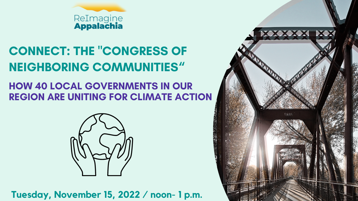 Please join ReImagine Appalachia on Tuesday, November 15th at noon for a webinar to learn from one of our region’s most successful local government coalitions. CONNECT, or the “Congress of Neighboring Communities” in Allegheny County, Pennsylvania encompasses 40 municipalities which have come together to create a shared vision of climate action for the region. Come, learn, and be inspired to make those same connections with your neighbors to collaborate on planning, funding, and administrative efforts.