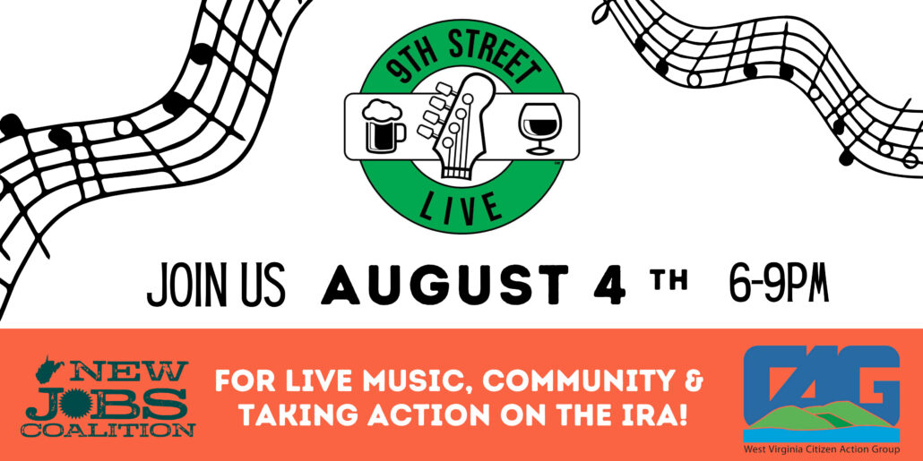 Join WV New Jobs Coalition & WV Citizen Action at 9th St. Live August 4th, in Huntington, WV for live music, community, and taking action on the IRA.
