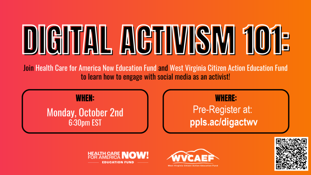 Join our DIGITAL ACTIVIST webinar training on Monday, October 2nd at 6:30pm, hosted by WV Citizen Action and Health Care for America NOW Education Fund.
